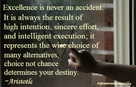 “Excellence is never an accident. It is always the result of high intention, sincere effort, and intelligent execution; it represents the wise choice of many alternatives, choice not chance determines your destiny.” Aristotle