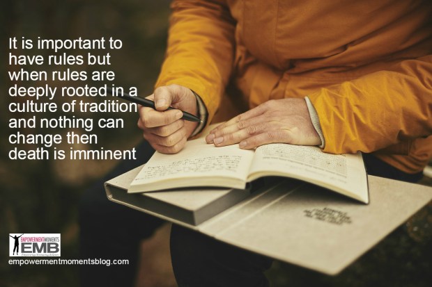 The culture of rigid rules can be found in things such as ‘the constitution, laws and by laws.’ Apparently there is no room for grace because ‘one strike, and you are out.’ It is important to have rules but when rules are deeply rooted in a culture of tradition and nothing can change because ‘that’s the way we have always done it,’ then death from that type of culture is imminent.
