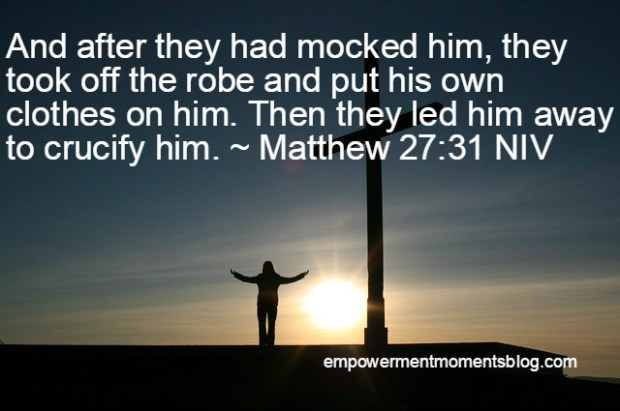 “And after they had mocked him, they took off the robe and put his own clothes on him. Then they led him away to crucify him. ~ Matthew 27:31 NIV; Mark 15:20; John 19:15-16