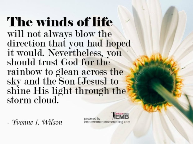The winds of life will not always blow in the direction that you had hoped it would. Nevertheless, you should still trust God for the rainbow to glean across the sky and the Son [Jesus] to shine His light through the storm cloud. – Yvonne I. Wilson